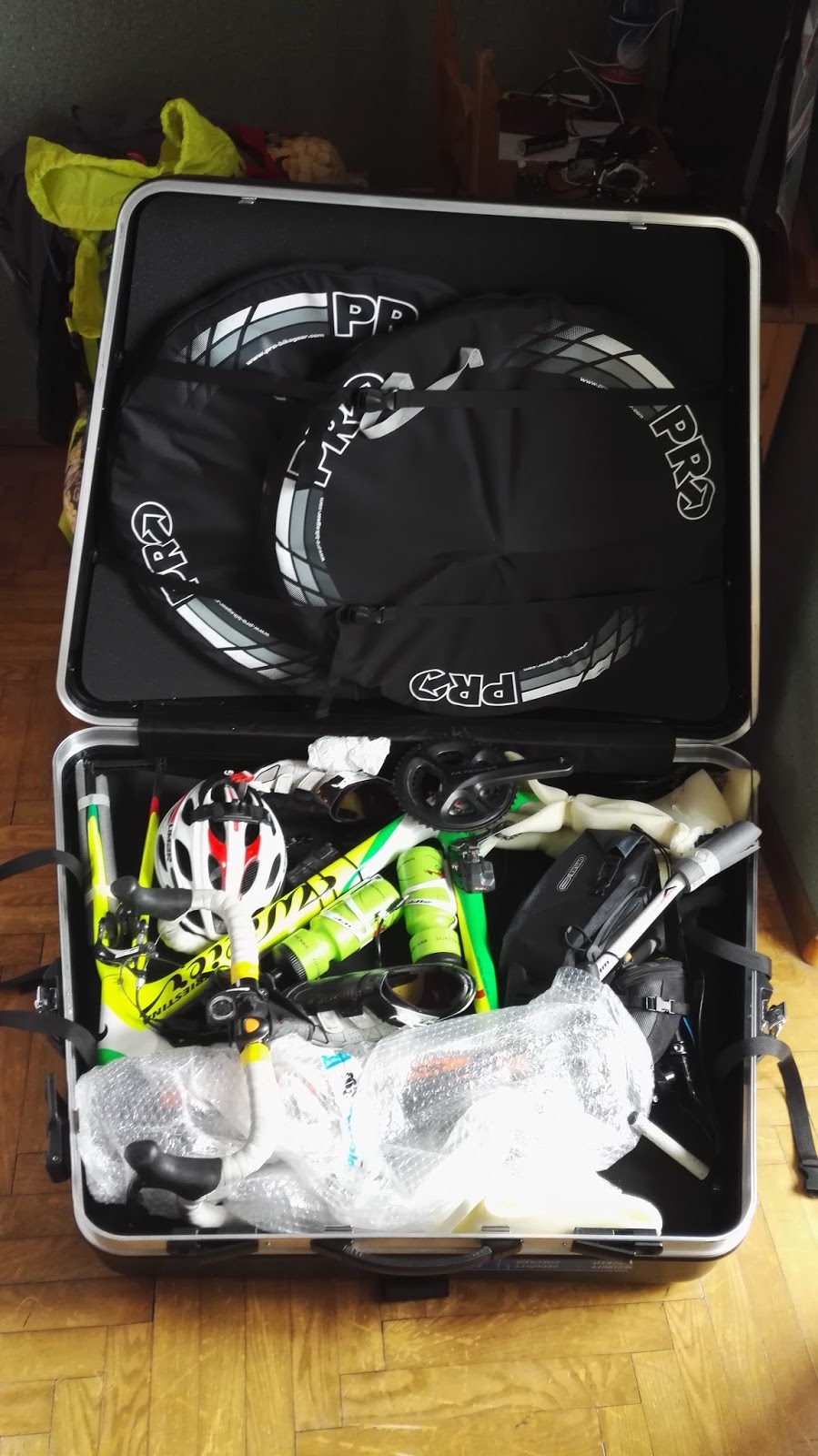 Ajokamojen arpomista, pyörän sovittaminen eka kertaa lentolaukkuun,